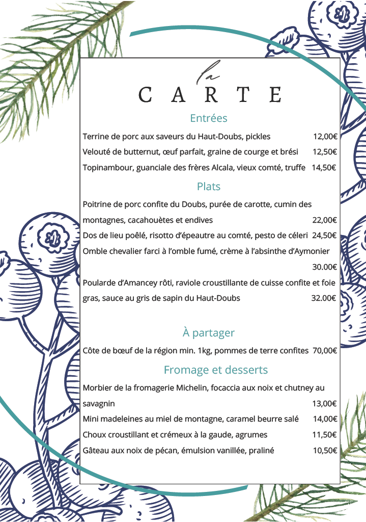 La carte a été conçue pour satisfaire un large éventail de préférences, proposant des plats à base de poisson, de viande et de légumes, allant des préparations les plus simples aux plus élaborées, afin de répondre aux attentes de l'ensemble de notre clientèle.